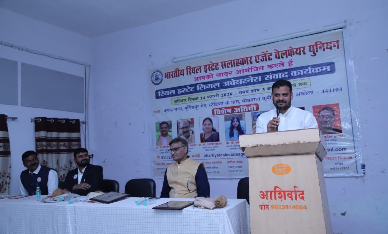 अकोला (प्रतिनिधी) (दि २०): भारतीय रियल एस्टेट सलाहकार / एजेंट वेलफेयर यूनियन यांच्या वतीने आयोजित “रिअल इस्टेट लीगल अवेअरनेस संवाद कार्यक्रम” कृषक भवन, डॉ. पंजाबराव कृषी विद्यापीठ, अकोला येथे उत्साहपूर्ण व गरिमामय वातावरणात नुकताच संपन्न झाला. कार्यक्रमाला रिअल इस्टेट सल्लागार, एजंट, बिल्डर्स व डेव्हलपर्स यांची मोठ्या संख्येने उपस्थिती लाभली.