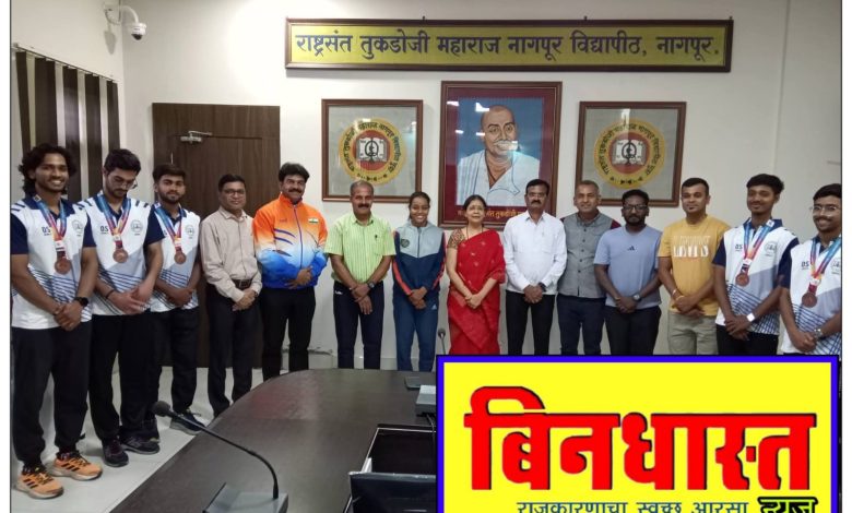 नागपूर : (दि २२) राष्ट्रसंत तुकडोजी महाराज नागपूर विद्यापीठाच्या कराटे संघाने अखिल भारतीय आंतर विद्यापीठ स्पर्धेत तृतीय स्थान पटकावले आहे. अखिल भारतीय आंतर विद्यापीठ स्पर्धेत विद्यापीठाचा नावलौकिक वाढविणाऱ्या कराटे संघाचा माननीय कुलगुरू डॉ. मनाली क्षीरसागर यांच्या हस्ते मंगळवार, दि. २१ एप्रिल २०२६ रोजी सत्कार करण्यात आला.